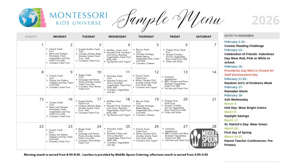 Middle Spoon Catering is proud to partner with Montessori Kids Universe to provide nourishing meals for the future leaders of North Carolina. We pride ourselves on using fresh and wholesome ingredients that are lovingly served daily. Our goal is to feed the body and mind of all students regardless of dietary restrictions or allergies in a way that is accessible and delicious. We feel privileged to be able to contribute to the success of the next generation.